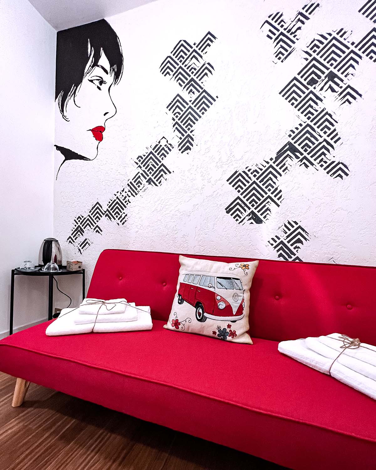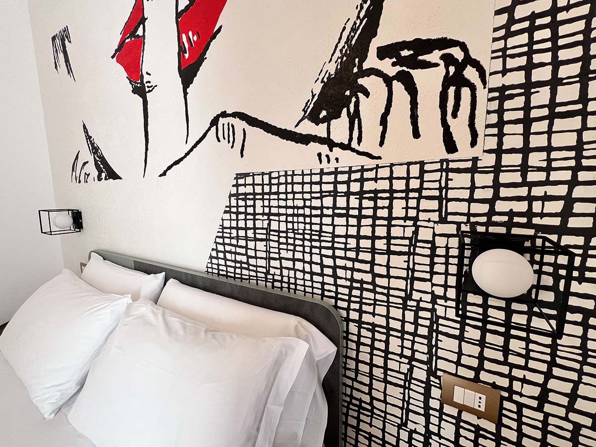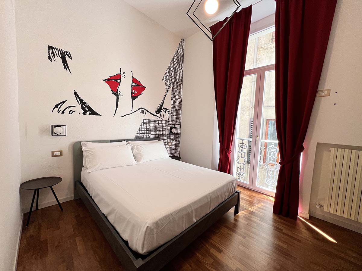 L'Ampia camera Matrimoniale è una camera dallo stile fresco e giovanile ispirato al fumetto di Valentina dotata di aria condizionata, piccolo salottino, bollitore per tè e tisane, bagno privato con doccia e frigorifero.