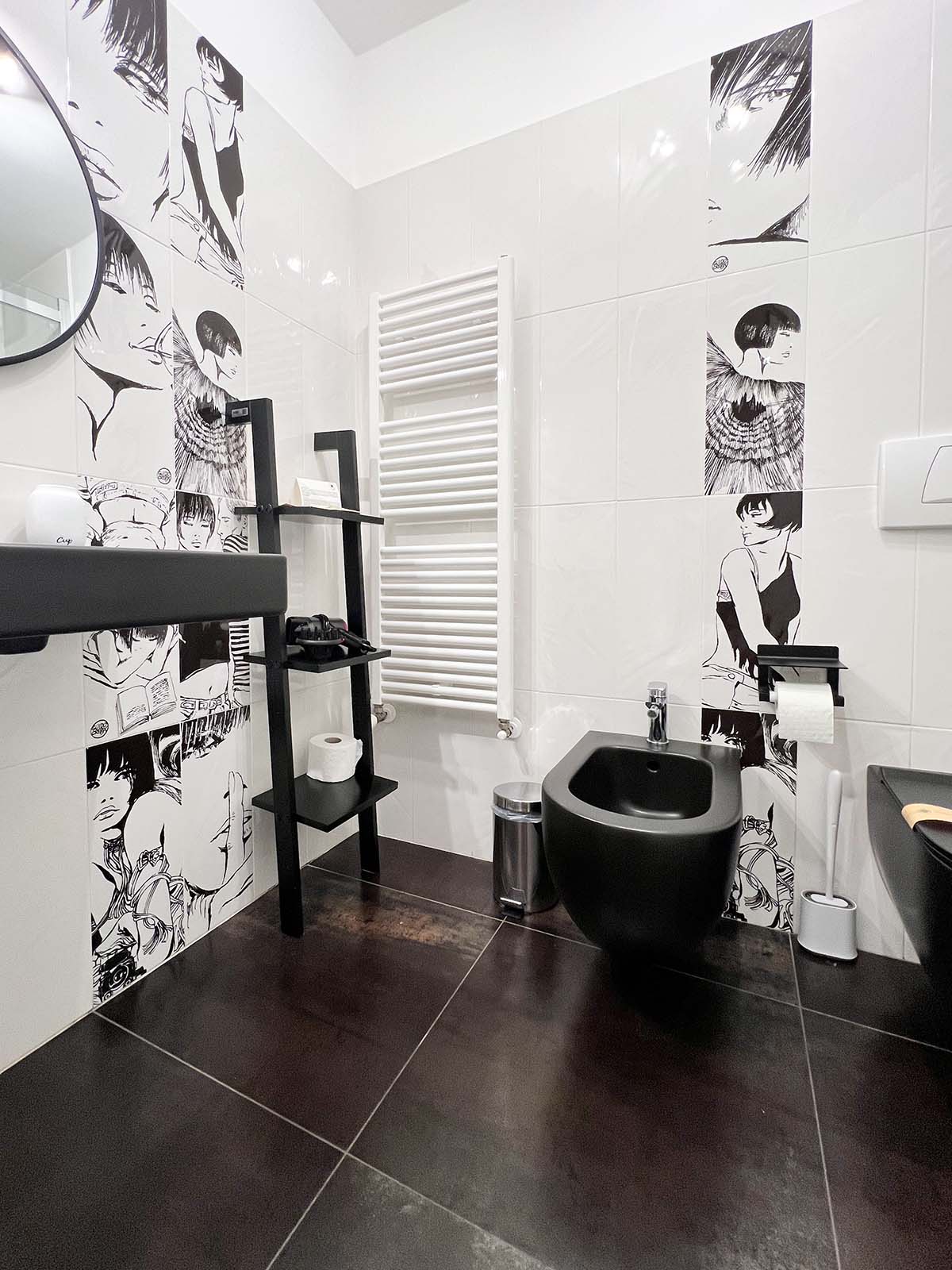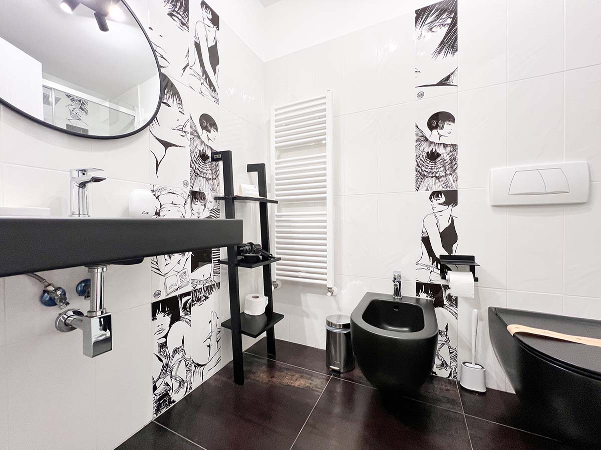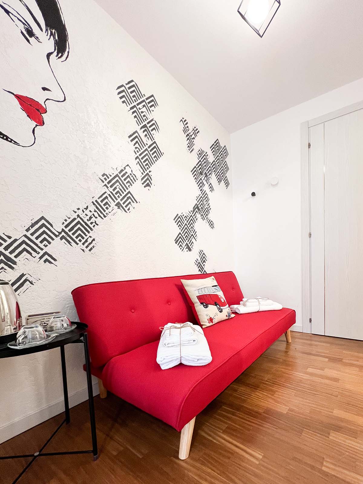 L'Ampia camera Matrimoniale è una camera dallo stile fresco e giovanile ispirato al fumetto di Valentina dotata di aria condizionata, piccolo salottino, bollitore per tè e tisane, bagno privato con doccia e frigorifero.